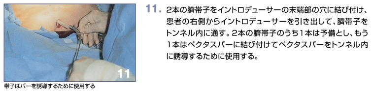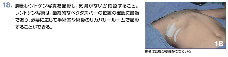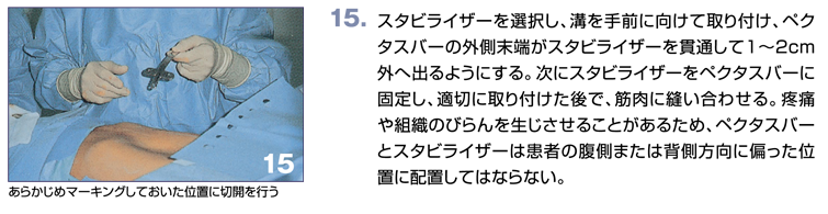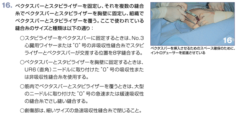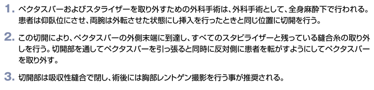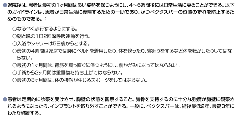 ●術後の疼痛管理およびペクタスバーの位置がずれるのを防止するため、術後の3日間は患者を十分に鎮静させること。投薬および治療法は痛みに対する患者の反応に応じて決定し、一般的な術式に従い硬膜外カテーテルの使用、過渡的な強度の疼痛のためのモルヒネ静注、患者自身で服用を決めさせる鎮痛剤(PCA)、および経口鎮痛剤を加えても良い。