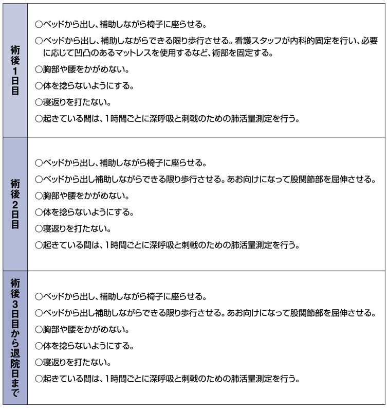 ●ペクタスバーの位置がずれるのを防止するためには、病院のスタッフがどのように術後の患者を扱うかが重要である。歩行自立するようになったら、患者は退院が可能である、以下のプロトコルが推奨される。